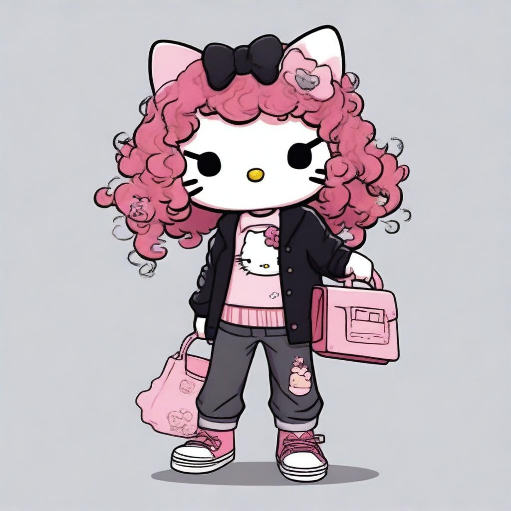 Chic Hello Kitty: Curly Red Style Prompt:una hello kitty de cabello rojizo y rizado con un pantalón ancho con roturas y un pullover negro y una cartera rosa COPY PROMPT