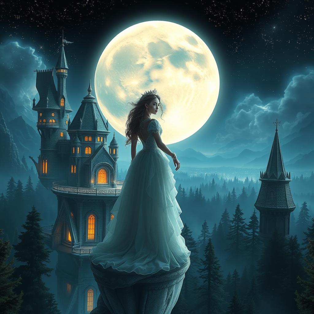 Enchanting Moonlit Princess Prompt:woman, fantasy, moon, night, sci-fi, dark, shine, princess, technology, castle, beautiful, wattpad style, space COPY PROMPT