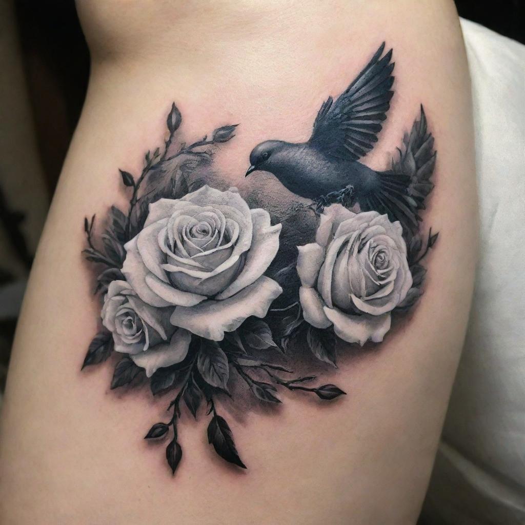 Ethereal Tattoo: White Roses and Black Doves in Harmony Prompt:White roses Black doves tattoo COPY PROMPT