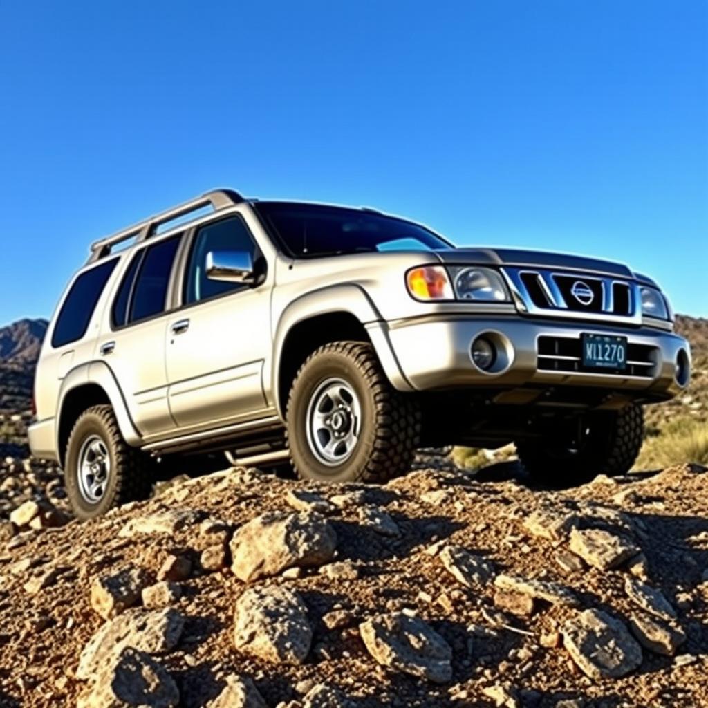 Explore the Rugged Elegance of the 2001 Nissan Pathfinder Prompt:Pathfinder model 2001 in silver color, very OEM with all terrain tires, all with an overlander style. Specifically 2001 model COPY PROMPT