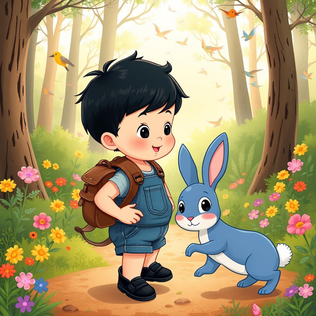 Cartoon a children story a 10 months baby boy, wearing short denim Jumper, thick black hair, black shoes, leather backpack stepped inside, he saw towering trees and colorful flowers he had never seen before. The sound of birds chirping sounded beautiful to his ears. Suddenly, a blue rabbit jumped in front of him.