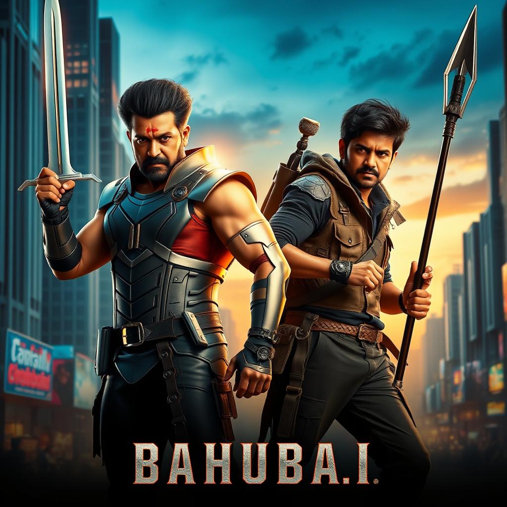 Modern Bahubali: A New Era of Heroes Prompt:Amrendra bahubali and mahendra bahubali poster in single frame in modern era COPY PROMPT