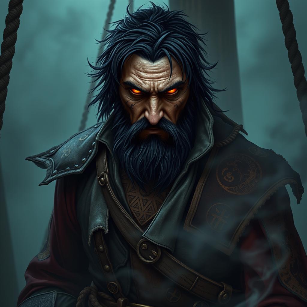 The Cursed Pirate: Dark Seas, Glowing Eyes Prompt:Cursed male pirate with short black hair and a short pointy beard without hat and glowing eyes COPY PROMPT