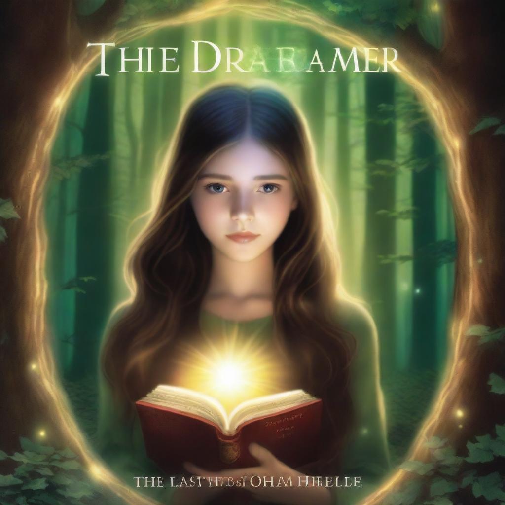 The Last Dreamer: An Enchanted Forest Whispers Prompt:Art of a girl in a forest holding a book in the middle with long brown hair, with a light ring around her. with the sentence written on top of the picture: THE LAST DREAMER COPY PROMPT