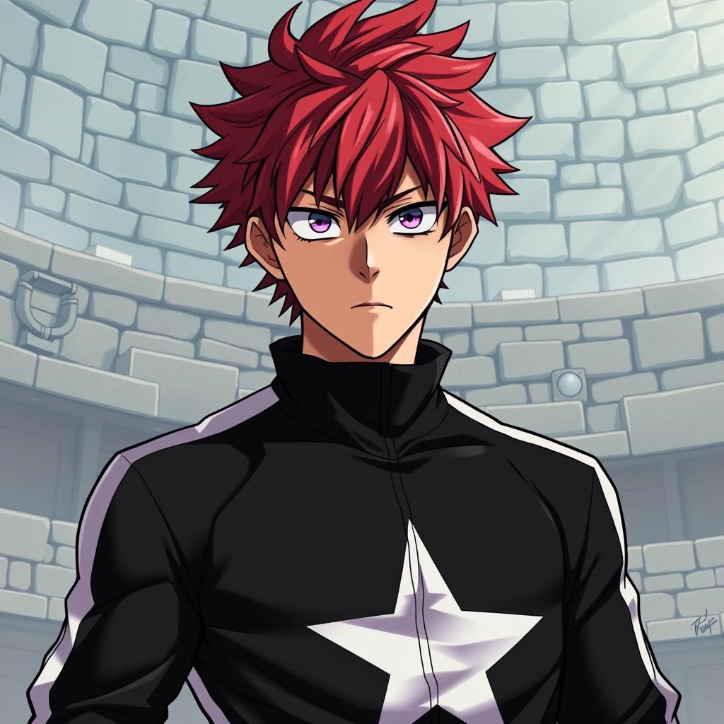 Unleash Your Inner Hero: Crimson Shaggy Power Prompt:MHA artstyle, male with shaggy crimson hair and amythest eyes dressed in black tracksuit with white star on the chest of the tracksuit. stone titled fighting arena behind him. COPY PROMPT